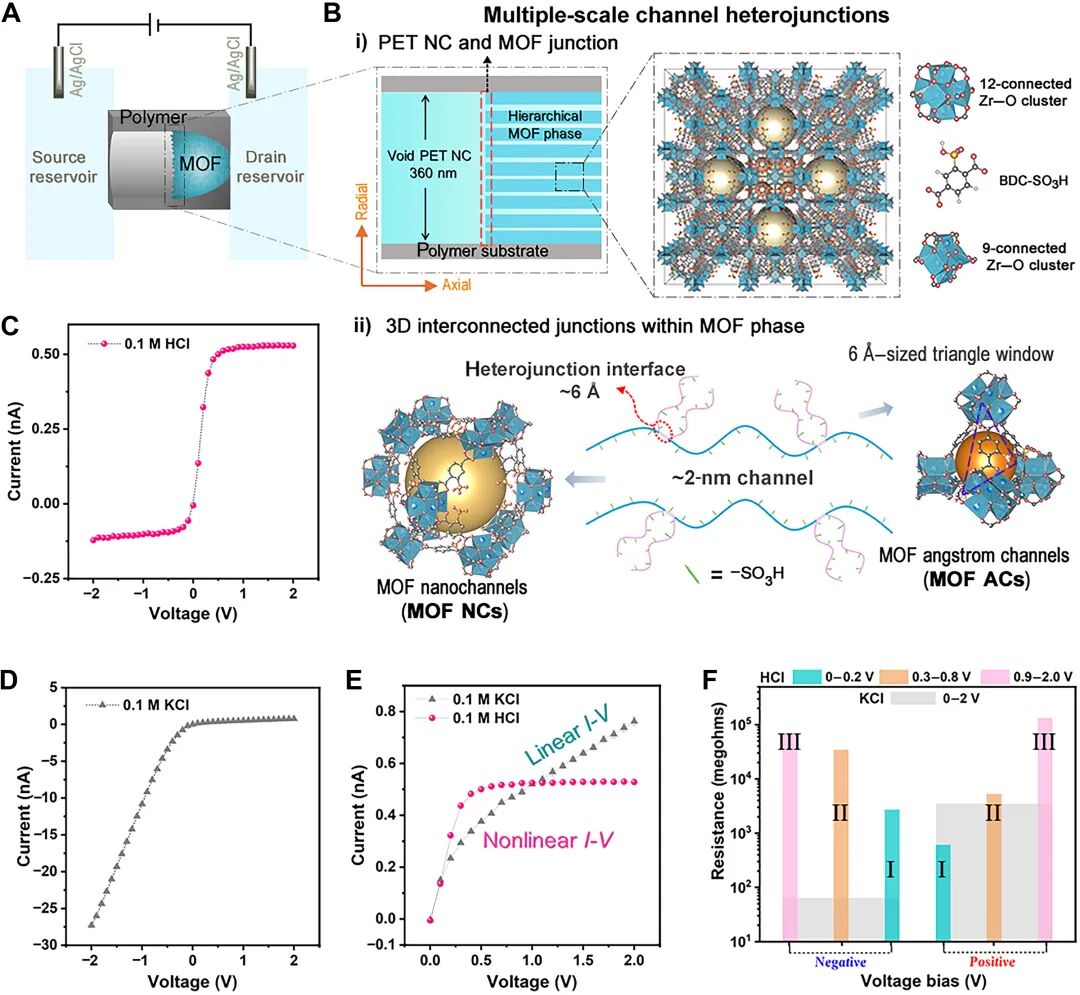 该器件首先通过在聚合物单纳米通道(NC)中组装分层Zr-MOF-SO₃H晶体,制备了具有多个异质结的分层MOF基纳米流控器件。
