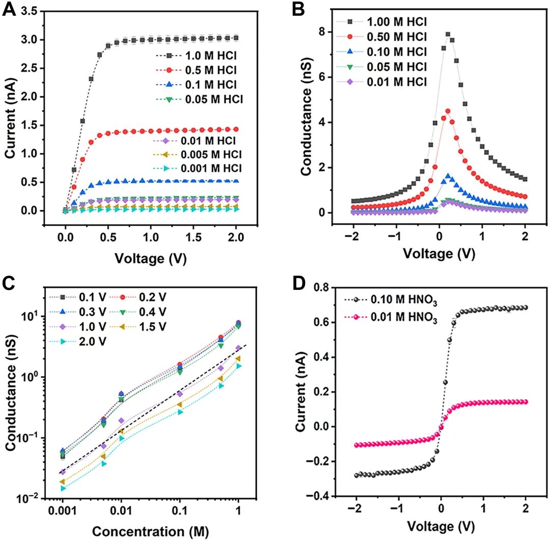 随后研究人员研究了浓度对其传输情况的影响,进一步证明了h-MOFNT对质子的普遍非线性传输特性。