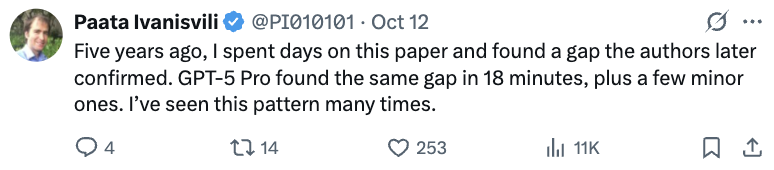 五年前,我花了数天时间研究这篇论文,才发现了一个作者后来确认的漏洞。而GPT-5 Pro仅用18分钟就找到了同样的漏洞,还额外发现了几个小问题。类似的情况我已经目睹过很多次了。