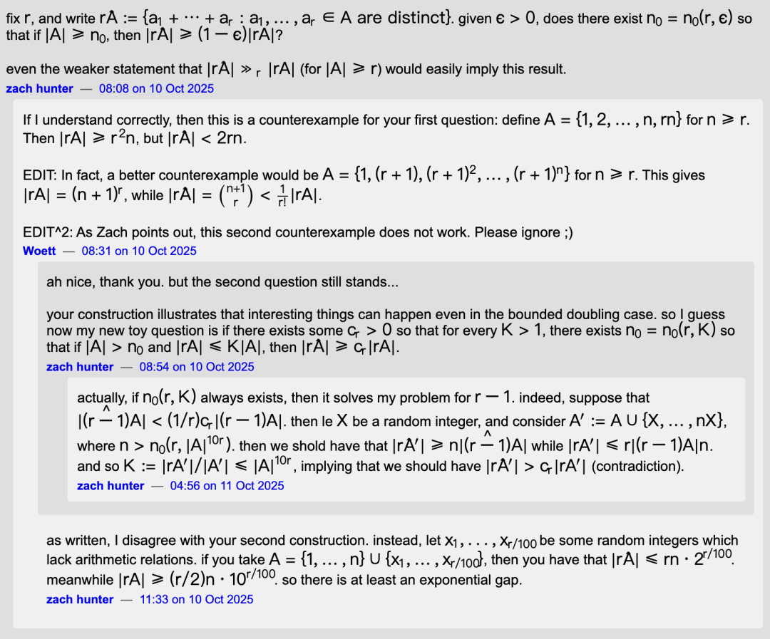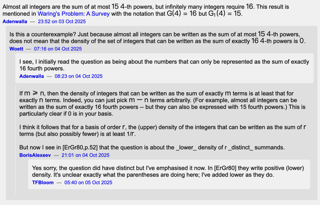 很快,Woett、BorisAlexeev等指出,华林问题里的例子是“允许元素重复”的情况,而埃尔德什问题#339要求“元素互不相同”,因此该例并不能构成反例,原问题的条件更为严格。