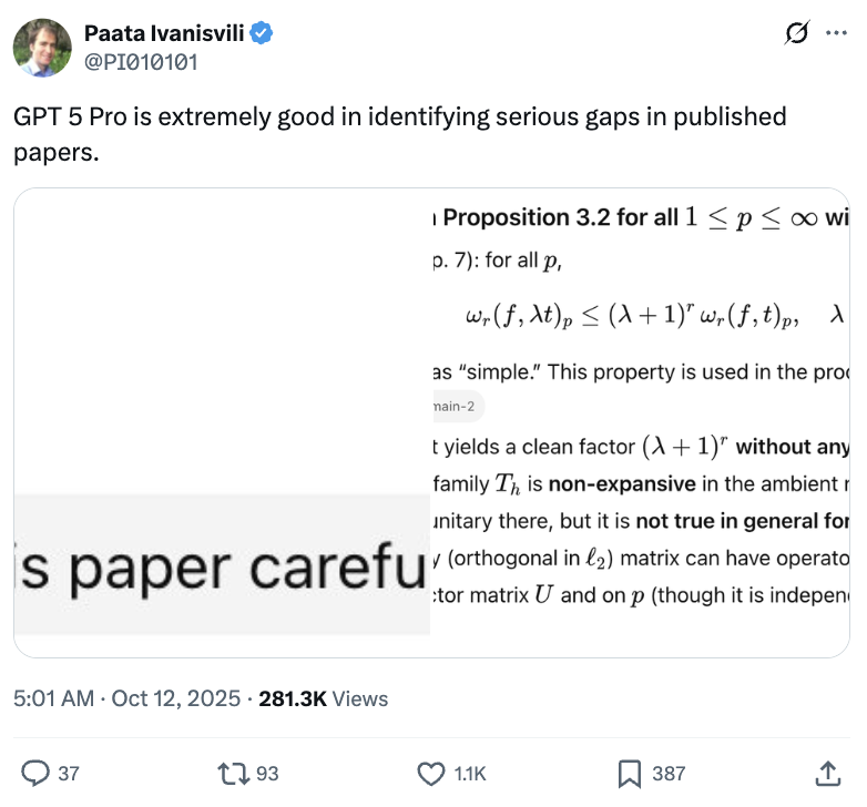 加州大学欧文分校数学教授Paata Ivanisvili也发推文表示,GPT-5Pro在识别已发表论文中的严重缺陷方面表现出色。