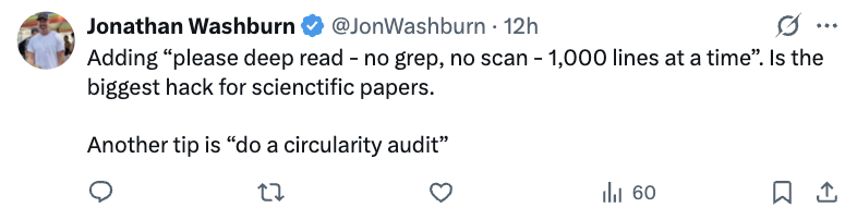在提示词中加入“请深度阅读——不要跳读,不要扫描——每次处理1000行”(please deep read - no grep, no scan - 1,000 lines at a time),堪称研读科学论文的终极技巧。
