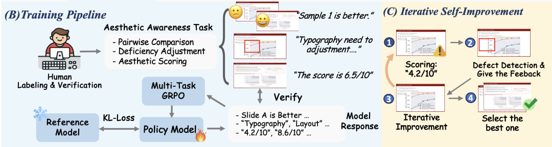 研究者采用了Group Relative Policy Optimization (GRPO)算法,通过人类偏好数据训练模型,使其能在反馈中逐步形成可解释的审美推理。与传统监督学习不同,这种方式让模型不仅会“打分”,还能说明原因,如“标题层级不清晰”“文字与图像间距不足”。
