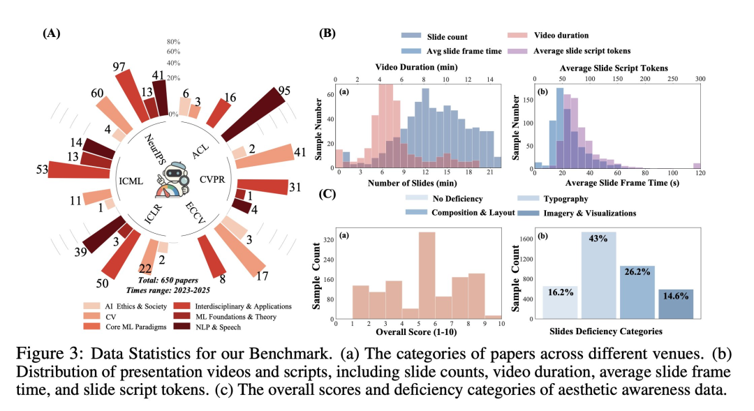 第一部分Presentation Generation Quality,收录650篇来自NeurIPS、ICLR、CVPR等顶会的论文,覆盖幻灯片、讲稿、视频等多模态形式,从叙事流畅性、布局平衡、美学分数等多个维度评估自动生成质量。