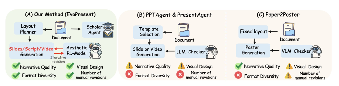 EvoPresent正是在此提出新的路径,让AI像人类讲者一样,在生成中反思,在反思中进化。