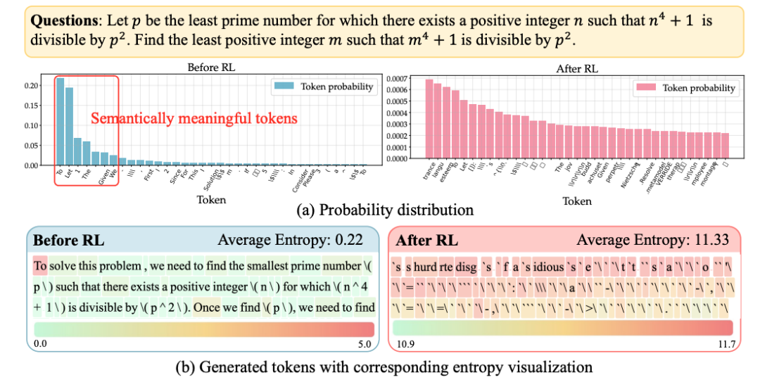 反之,当𝛽稍大,模型便极易在庞大的动作空间(数十万个token)与超长的推理轨迹(上千步生成)中失控。根据熵的定义,当概率分布越“平”,熵就越高。而在如此庞大的词表中,哪怕只把一点点概率质量从高义词(如“因此”)挪到无意义词(如“<”“#@$%”),也能带来显著的熵增。