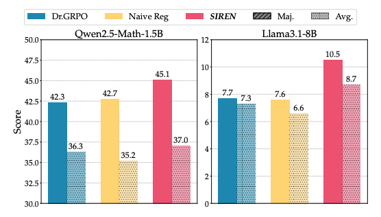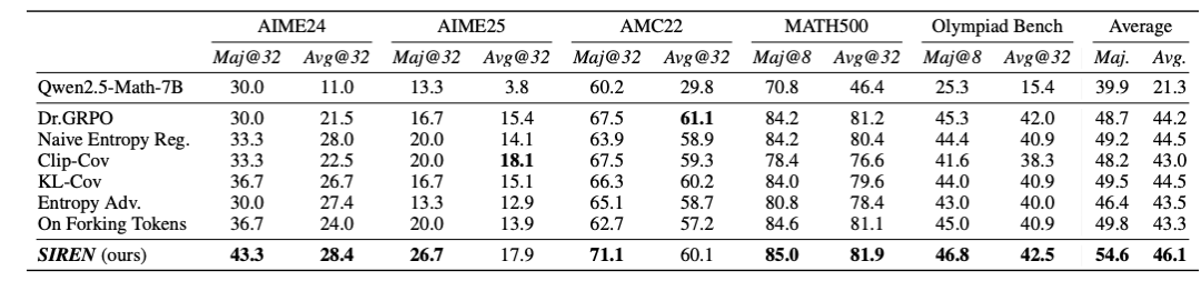 在Qwen2.5-Math-7B上,SIREN平均maj@k达54.6%,超越最强基线4.8%。
