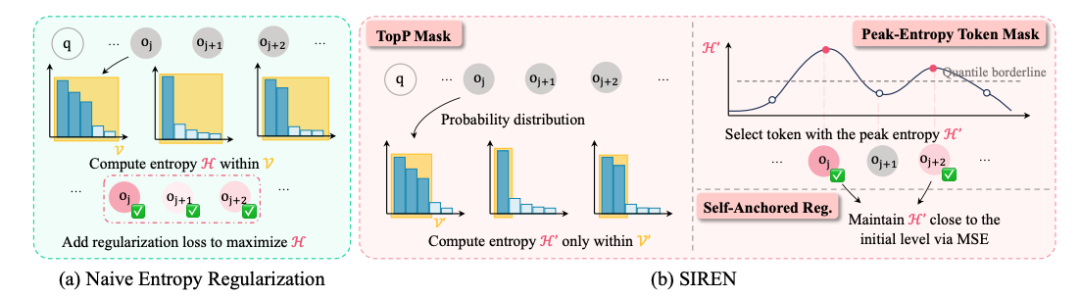 针对传统方法的不足,研究人员提出选择性熵正则化方法(SIREN),通过结构化约束实现探索过程的精细调控。SIREN包含三个核心机制: