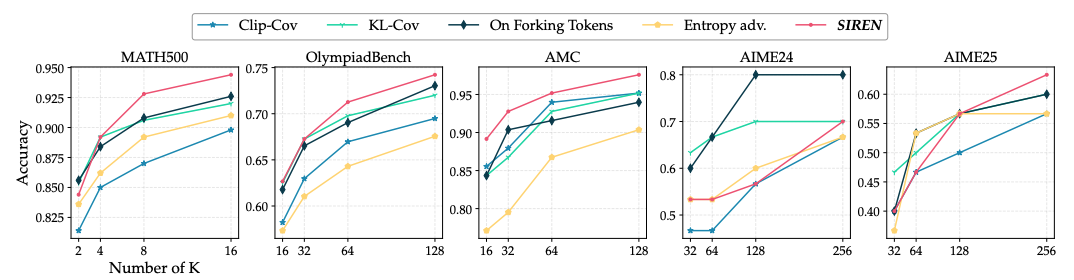 下图中,SIREN展现出较高的pass@k,探索边界显著扩展: