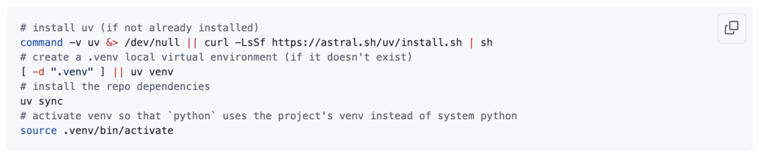 首先需要确保安装了当下热门的uv项目管理器。安装uv,在.venv目录下创建一个新的虚拟环境,获取所有依赖项,然后激活该环境,这样当输入python时,使用的是虚拟环境中的Python,而不是系统自带的Python: