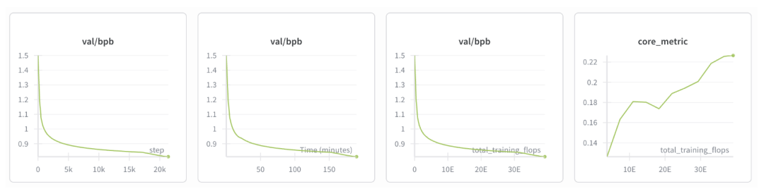 随着时间的推移,bpb下降是好的迹象(说明模型能更准确地预测下一个token)。此外,CORE分数在上升。
