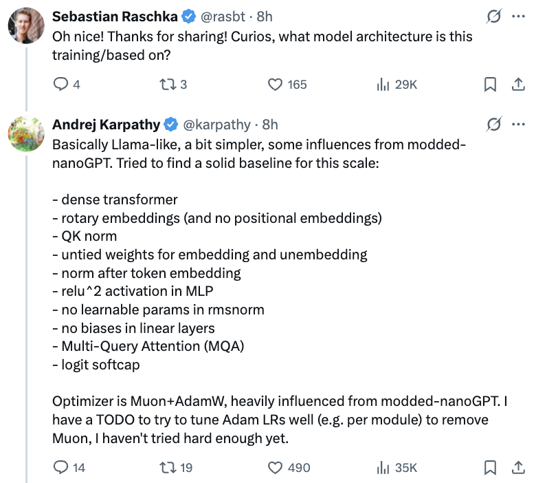 在评论区,卡帕西还解释了nanochat基本架构与Llama类似,但更简化一些,也借鉴了部分modded-nanoGPT的设计,整体是为此规模的模型找到一个稳健的基础架构。