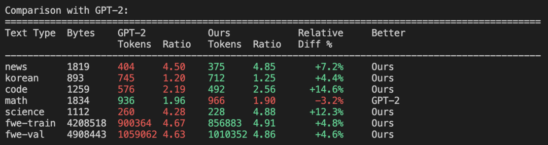 尽管如此,即使在词汇量较小的条件下,我们在FineWeb数据集上仍以微弱优势超越了GPT-4——因为这正是我们训练所用的数据集,所以我们的分词器能完美契合该文档分布(例如在英语文本压缩方面可能更具优势)。