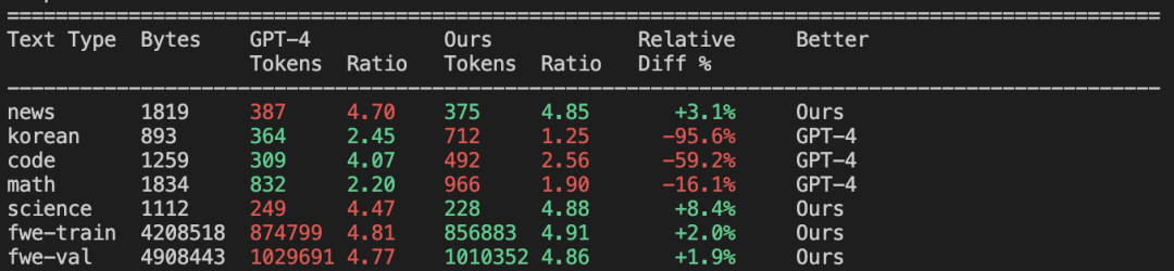 评估结果显示,实现了约4.8的压缩比(即原始文本中平均4.8个字符压缩为1个token),还可以看到与GPT-2、GPT-4分词器的对比结果。