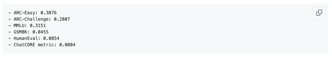 ChatCORE:这是卡帕西尝试复制CORE分数对基础模型的评估方式,并将其扩展到聊天模型的成果。也就是说,将上述所有指标都减去基准性能,这样分数就在0到1之间(例如,随机模型得0分,而不是MMLU上的25%),然后报告所有任务的平均值。它是对当前模型实力的一个单一数字总结。