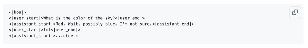 模型学习与多轮对话相关的特殊token(除了用于分隔文档的<|bos|>token,基础模型预训练期间没有这些token)。