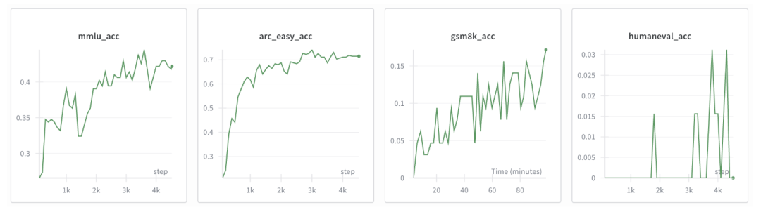 确实没有一个很好的图表来展示这一步,但这里有一个之前对另一个更大的模型进行中期训练的例子,只是为了让你了解在微调运行期间这些指标上升时的样子: