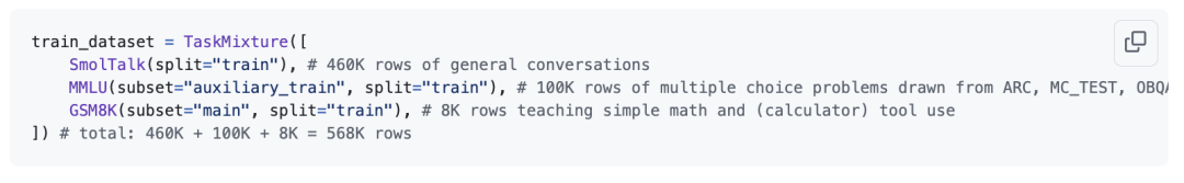 在SmolTalk用户-助手对话数据集、多项选择题数据集、工具使用数据集上进行中期训练(Midtrain)