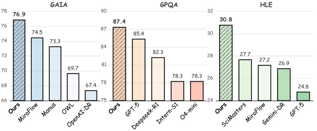 FlowSearch在三大权威基准GAIA、GPQA-diamond、HLE上,全面超越现有方法。