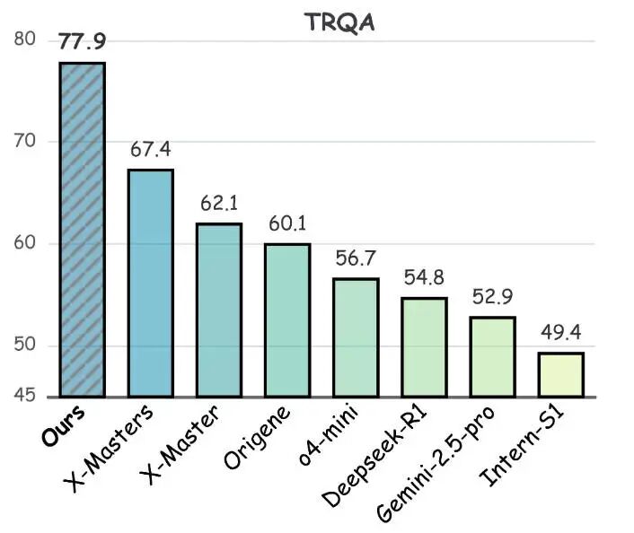 在生物领域的专业基准TRQA上,FlowSearch依托通用工具链超越了多个领域专用模型,显示出强大的专业问题解决能力。