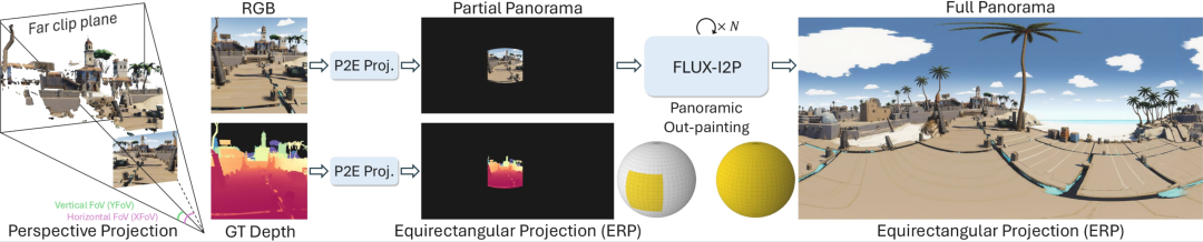 具体来说,给定一个已知水平和垂直视场角的透视RGB图像,首先应用透视到等距矩形(Perspective-to-Equirectangular,P2E)投影将图像映射到球面空间。