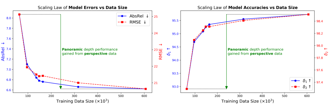 为此,研究团队将使用全景图的外推引擎进行全景外推,以生成与模型输入匹配的“完整”全景图。对于相关的GT深度,研究团队仅应用P2E投影,而未进行外推,因为外推深度的绝对精度很难得的保证。总体而言,该数据扩充引擎显著提升了全景数据的数量和多样性,并显著增强了DA2的零样本性能,如图3所示。