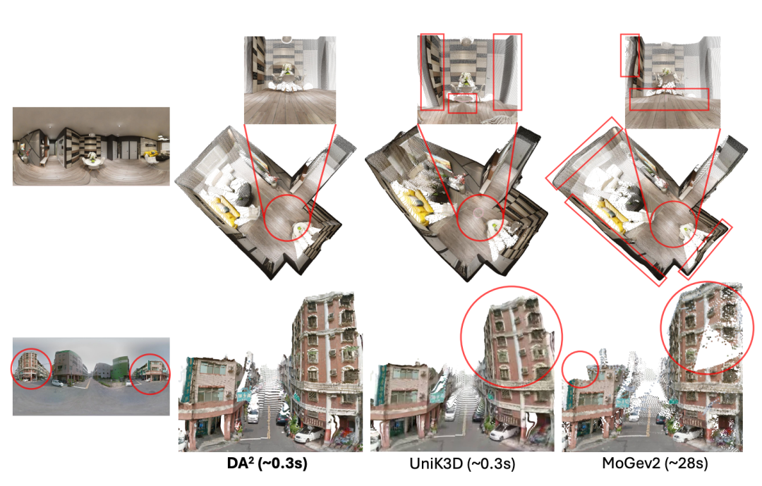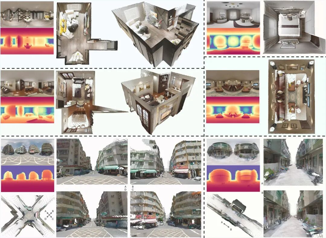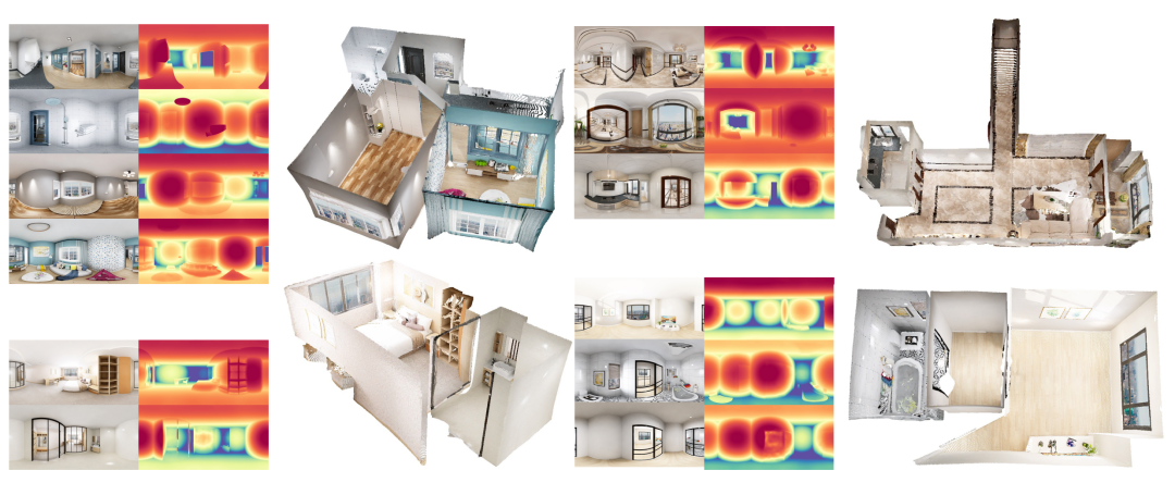 如图7所示,DA2能够根据房屋/公寓不同房间的全景图像,重建全局对齐的3D点云,确保不同房间的多个全景视图之间的空间一致性。