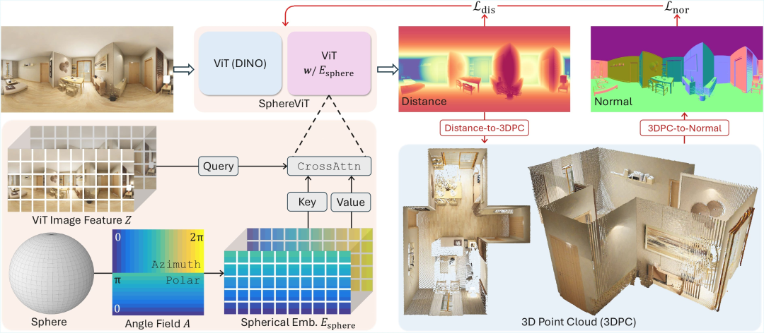 为了减轻球面畸变的影响,受Vision Transformers (ViT) 中位置嵌入的启发,研究团队提出了SphereViT——DA2的主要模型架构。