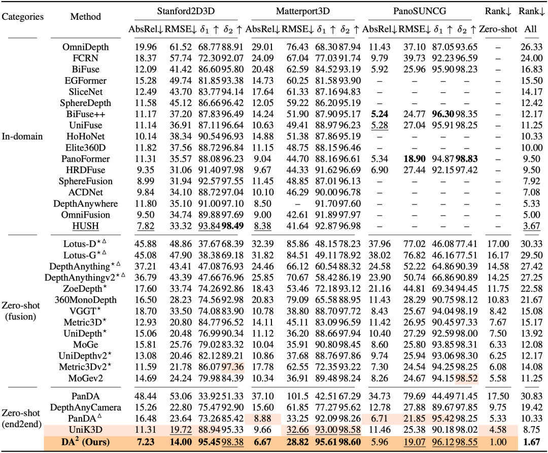 如表1所示,DA2展现出了SOTA性能,其AbsRel性能比最强的zero-shot方法平均提升了38%。