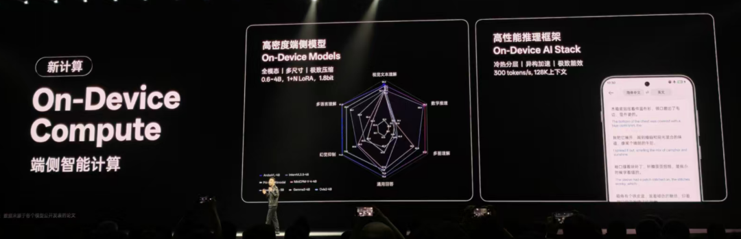 新计,指的是端侧智能计算,通过极致压缩等技术,能够在端侧部署全模态、多尺寸模型,高性能推理框架能够实现300token每秒的推理速度,上下文长度达到128k。