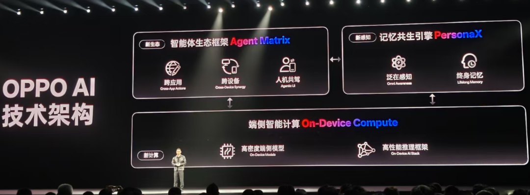 功能之外,OPPO也宣布了全新的OPPO AI技术架构,涵盖了新计算、新感知和新生态三个层次。
