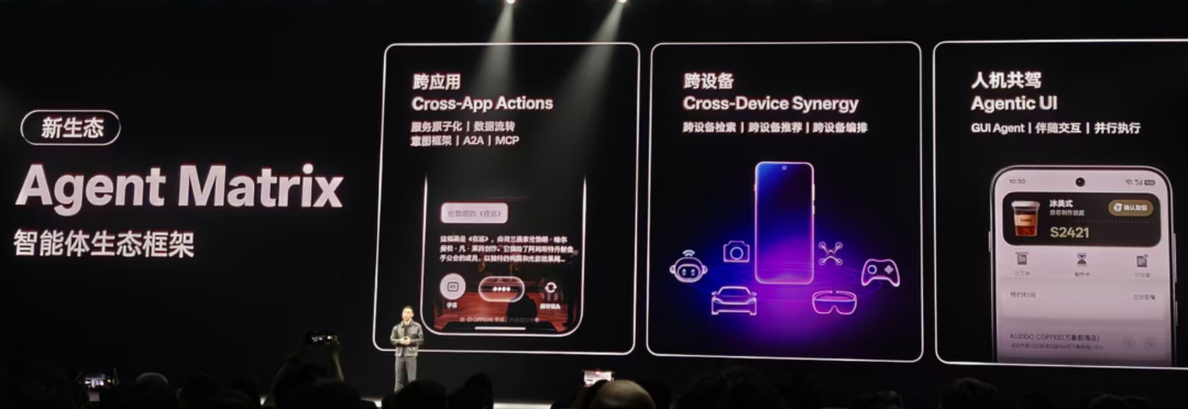 新生态,则是智能体生态框架,通过将意图框架及原子化服务,结合MCP、A2A等协议接口,实现跨应用的端侧AI能力,以及跨越设备和人-机之间的交互协作,