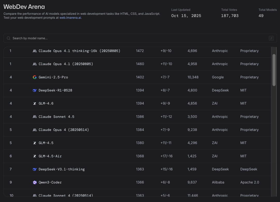 在文本排行榜中,顶级闭源模型如GPT-5、Gemini-2.5-pro、Claude-Sonnet-4.5等之后,紧随而来的就是智谱的GLM-4.6和DeepSeek-v3.2。