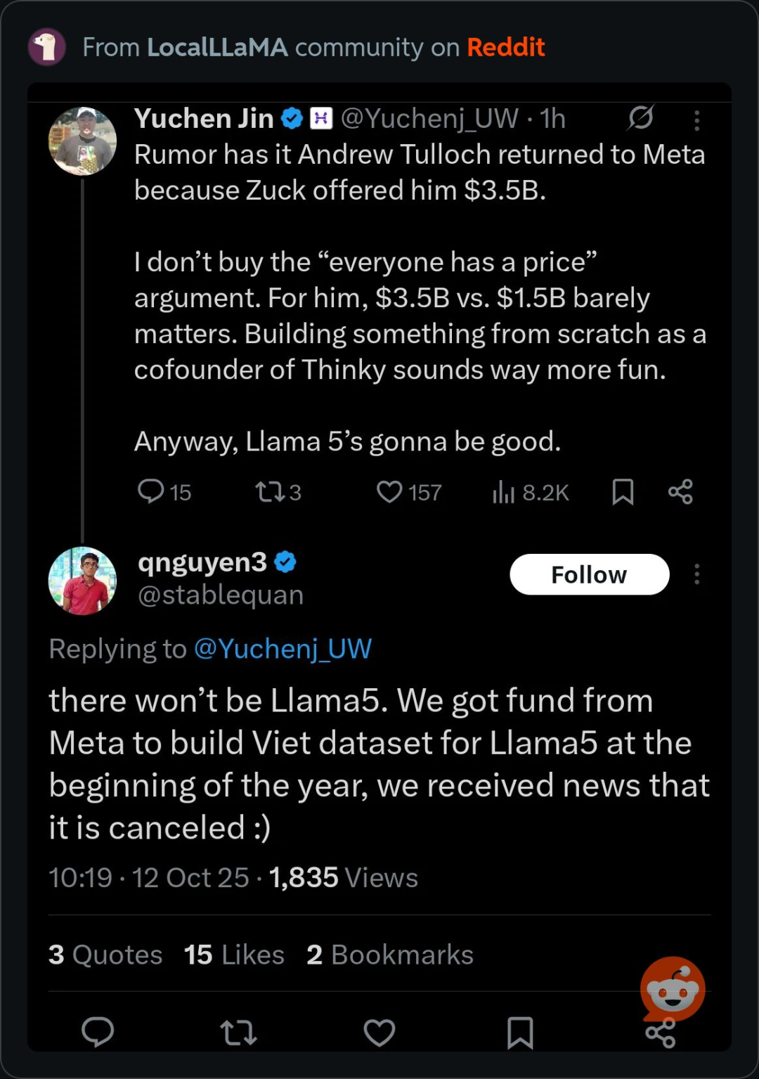 但这边刚期待,就有人冒出来泼冷水:Llama 5无了。