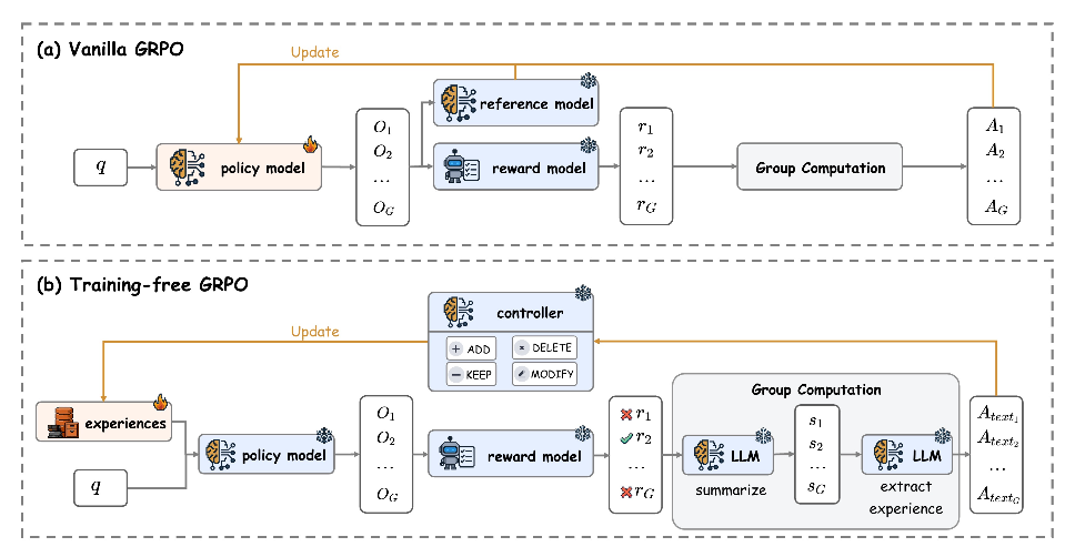 Training-Free GRPO重新利用了传统GRPO基于组间相对评估的核心逻辑,但将其转化为非参数化的推理阶段过程。