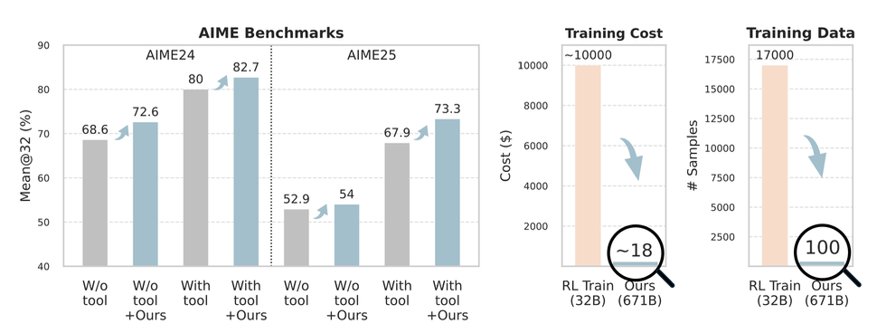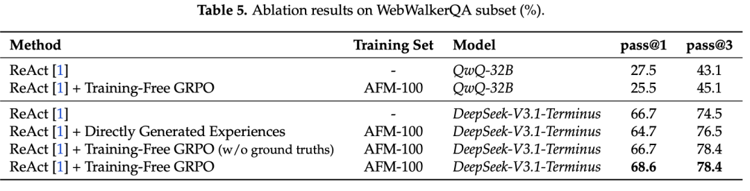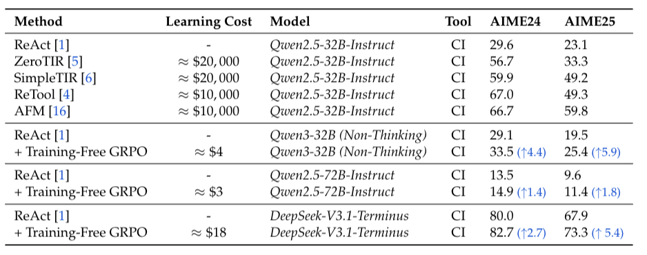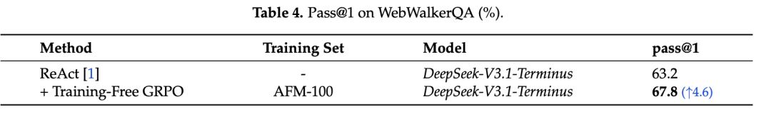 实验表明,在数学推理和网页搜索任务上,利用无训练GRPO的DeepSeek-V3.1-Terminus模型展现出显著的跨领域性能提升。