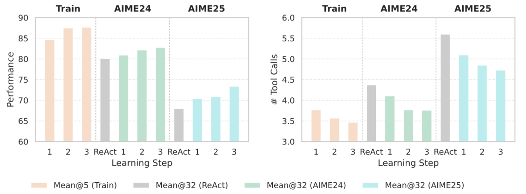 在AIME24和AIME25实验中,随着每一步学习,模型表现持续提升,这表明仅从100个问题中学到的经验能够有效泛化,同时也凸显了多步学习的必要性。