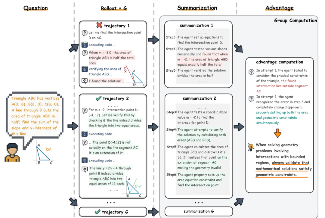 随后,Training-Free GRPO生成自然语言形式的组相对语义优势。