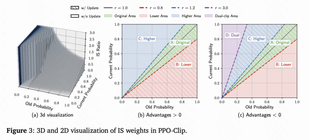 它将正优势token的重要性采样权重取倒数,让低概率token得到更强的更新,而高概率token被适当削弱: