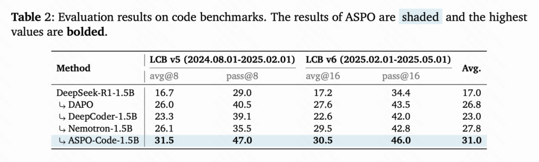 在代码基准LiveCodeBench v5上,ASPO达到了31.5 avg@8 / 47.0 pass@8的成绩,领先主流RL方法(DAPO、DeepScaleR、Nemotron等)。