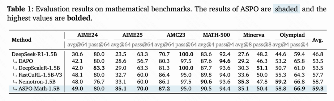 在一系列数学推理(AIME24/25、AMC23、MATH-500、Minerva、Olympiad)和代码生成(LiveCodeBench v5/v6)基准测试中,ASPO展现出显著优势: