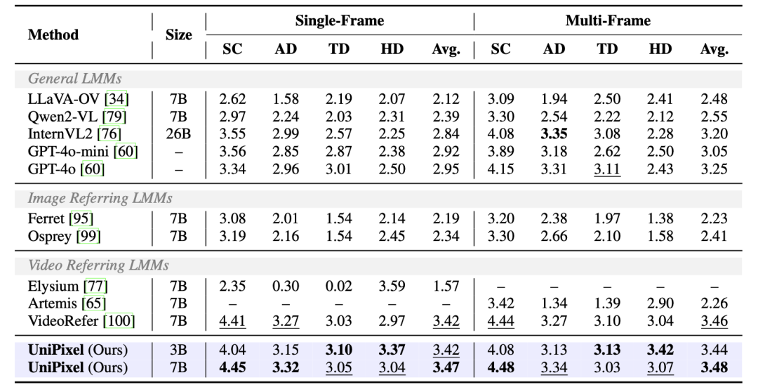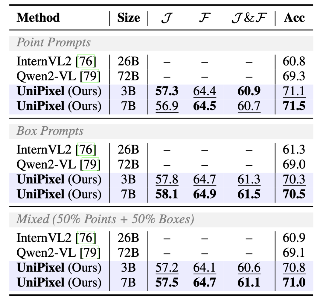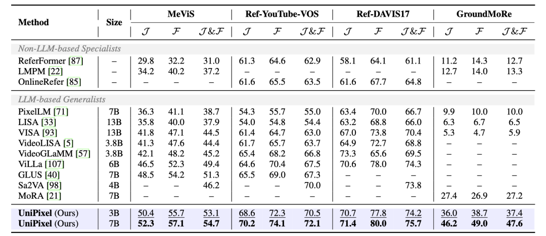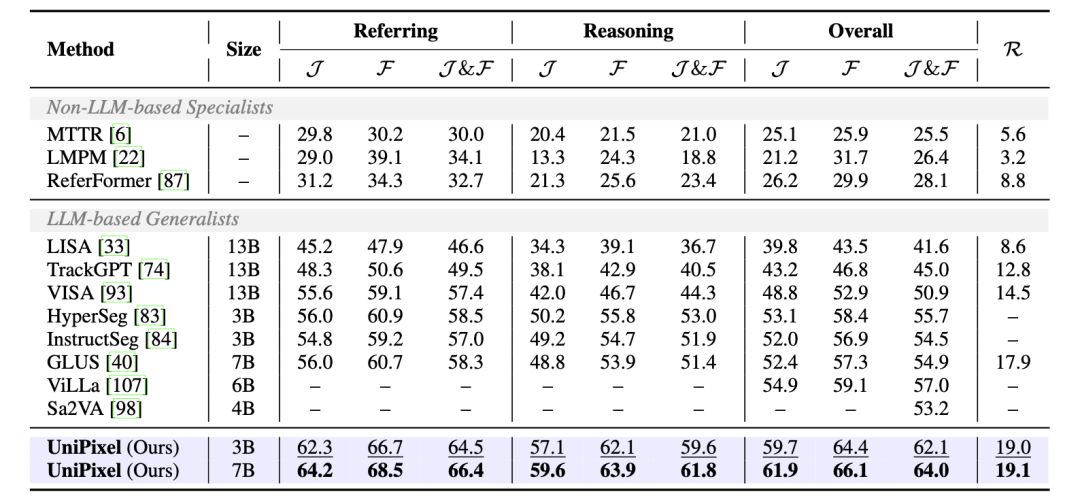 在本任务上,UniPixel展现出了出色的多任务建模能力,如表所示,其性能超越72B的传统模型。