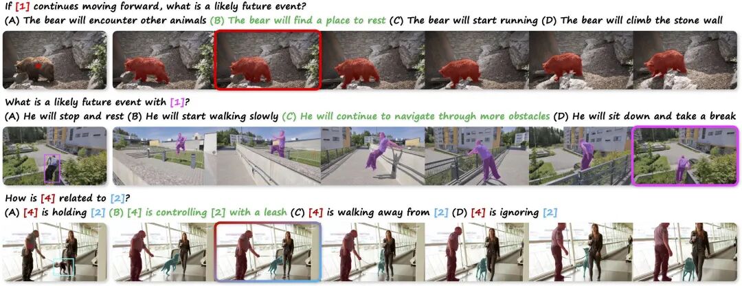 例如,当用户问“[1]和[2]之间有什么互动?”时,模型可以将两者的行为轨迹通过掩码抽象出来,并从原图片或视频中重新感知以生成合理回答。