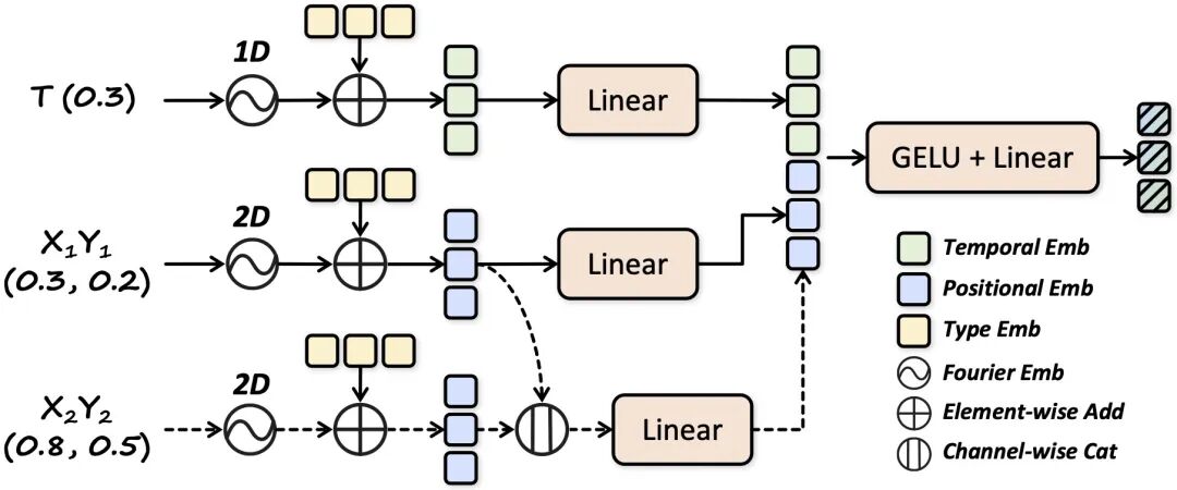 这一编码方式融合了空间坐标、时间位置、提示类型等信息,并借助编码投影层与视觉Token进行对齐。