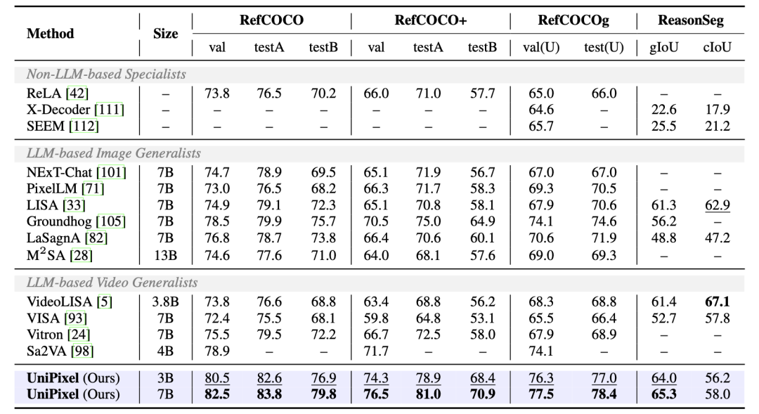得益于统一的框架设计和渐进式的训练范式,UniPixel在分割任务上展现出显著性能优势。