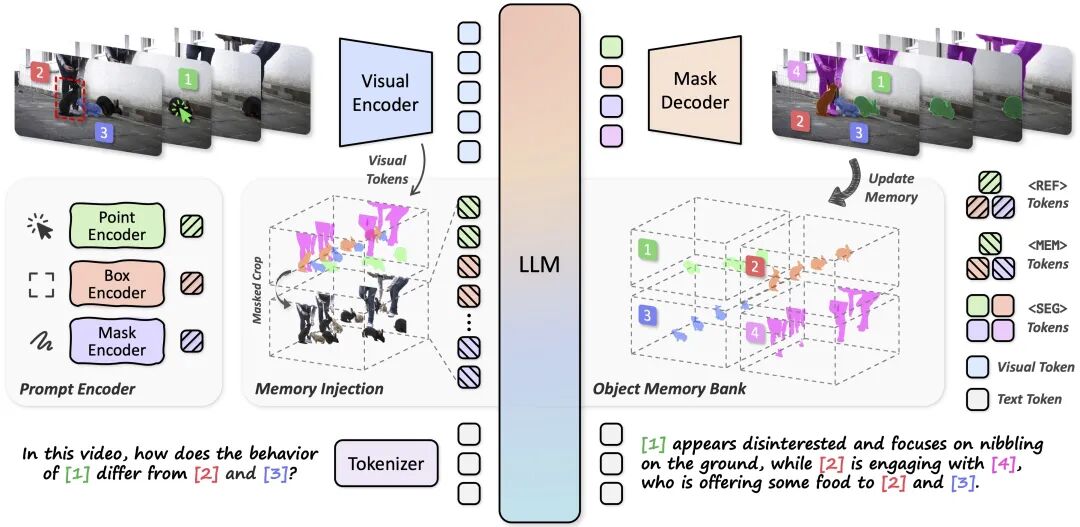 这些掩码随后通过对原图片或视频进行池化,转化为LLM可识别的对象特征,用于回答更复杂的语义问题。
