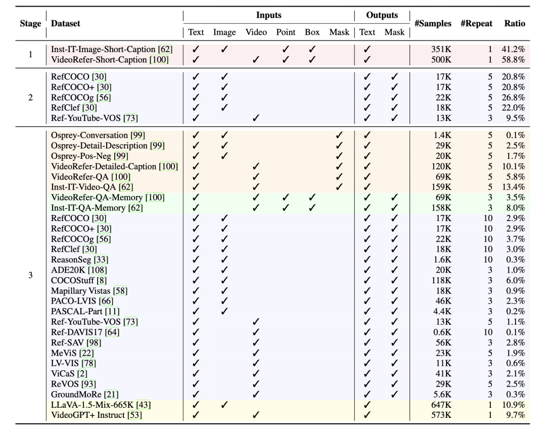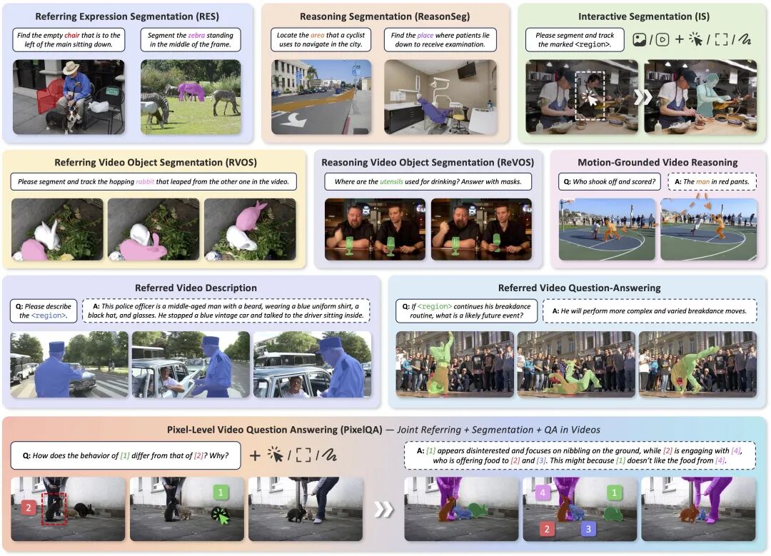 整个训练数据规模达到约100万条样本(具体见下表),支持从静态对象指代到时序掩码生成等多种任务类型。这些数据为模型提供了统一、多样的训练环境,提升了其在不同任务设置下的适应能力。