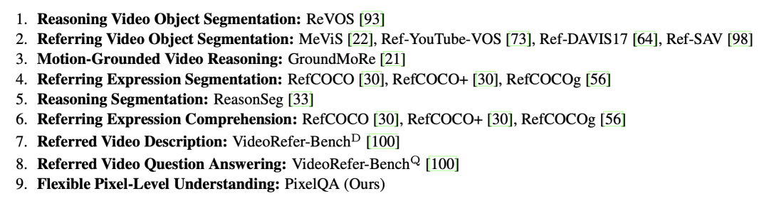 为了验证UniPixel框架的有效性,作者在10个公开基准测试集上进行了广泛的实验,涵盖9大视觉-语言理解任务,具体任务和数据集设置如图所示。