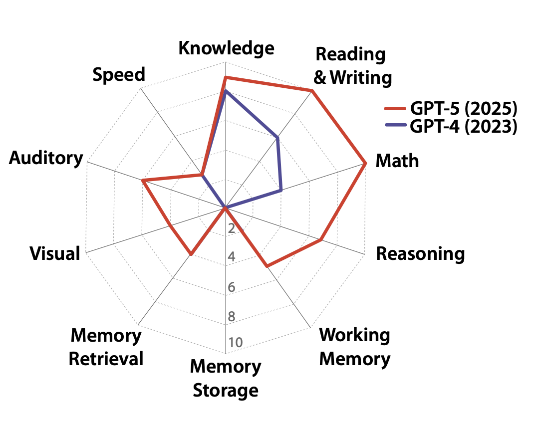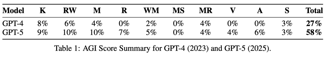 但从AGI的及格线100分来看,即使是GPT-5,也尚未突破半程线,甚至在长时记忆存储领域中拿了0分。