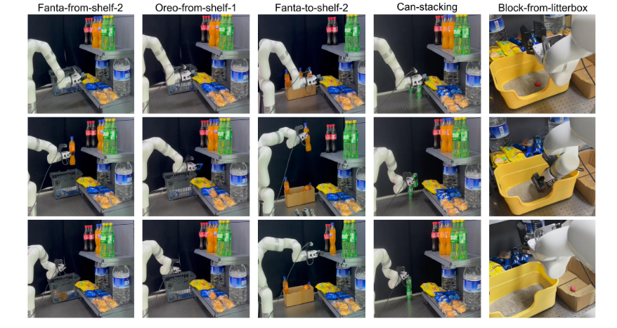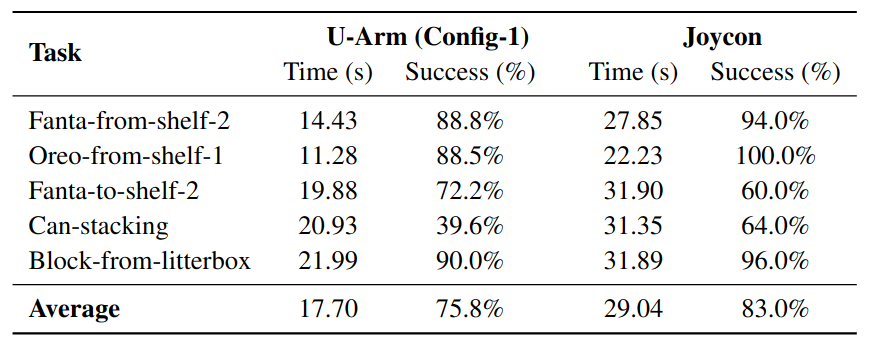 团队在5种夹爪操作任务(从2层货架上夹取芬达放入纸箱、从1层货架夹取饼干、从纸箱中分拣商品放回货架、堆叠易拉罐、在猫砂盆中夹取草莓)对U-Arm的遥操作性能进行了实验。
